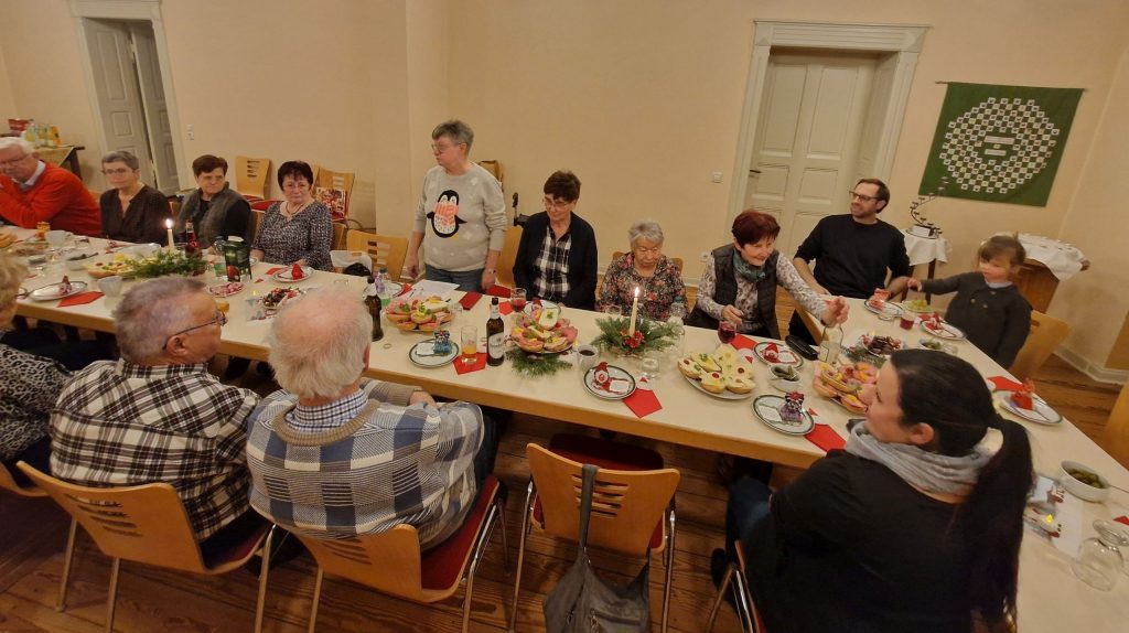Am 27.11.2025 fand im Gemeindehaus der evangelischen Kirche die Weihnachtsfeier des Heimatvereins Gommern statt. 23 Mitglieder haben sich um 18.00 Uhr getroffen, um sich in geselliger Runde auf die beginnende Adventszeit einzustimmen. Im Vorfeld hatten einige Mitglieder die Tafel sehr liebevoll eingedeckt und alles vorbereitet.